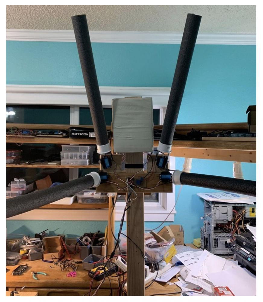 He made a table stand out of wood, pulled a metal strap to hold it together from an oil can and connected that to the pool noodle and a motor.